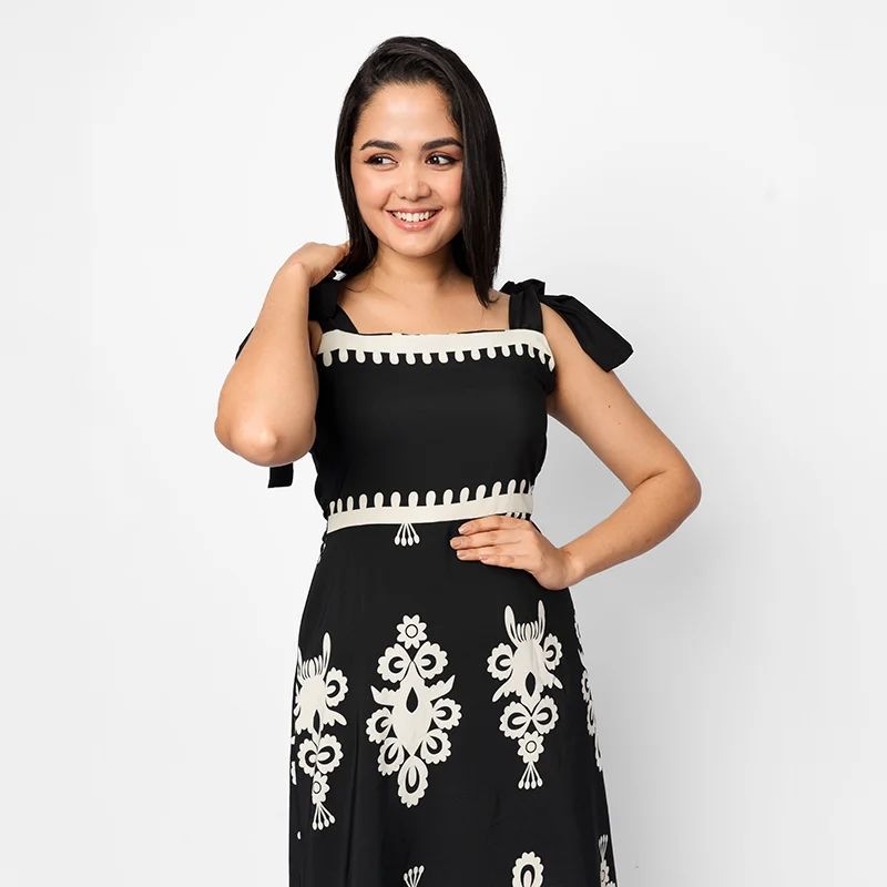 Elevate your look with the refined charm of this maxi dress. Featuring bow-tie shoulder straps, a square neckline, and a flowing A-line silhouette, it offers both grace and comfort. The bold scrollwork motifs and border detailing bring a touch of artistry, while the relaxed fit ensures effortless sophistication.