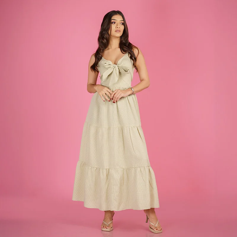 Discover timeless elegance in our nori Maxi Dress. This enchanting piece features a delicate gingham pattern with a charming bow-tie front and a flowing tiered skirt for a flattering silhouette. Crafted from lightweight, breathable cotton flex fabric, it blends comfort with style effortlessly. Perfect for garden parties, brunch dates, or any occasion where effortless chic is key. Keep it fresh and pristine: machine wash cold with mild detergent, tumble dry low, and iron on low heat if needed. Our dress is crafted for enduring elegance, with enhanced durability and breathable comfort to keep you cool all day.