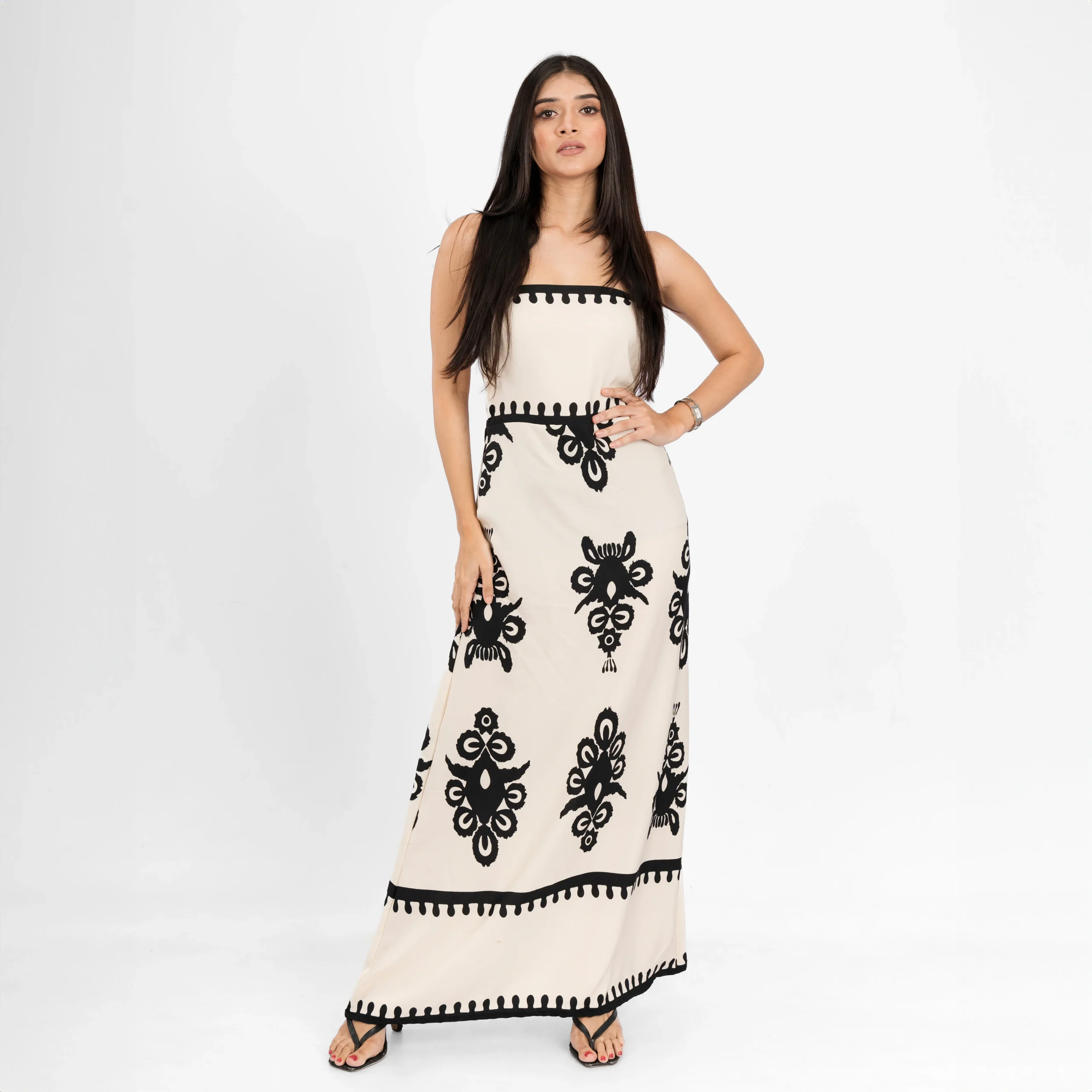 Step into effortless elegance with this beautifully designed maxi dress. Featuring a flattering square neckline and a sleek, sleeveless silhouette, this dress is perfect for any occasion. The bold, intricate patterns add a unique charm, while the flowing design ensures a graceful and comfortable fit. Whether styled casually or dressed up, this piece makes a statement with ease.