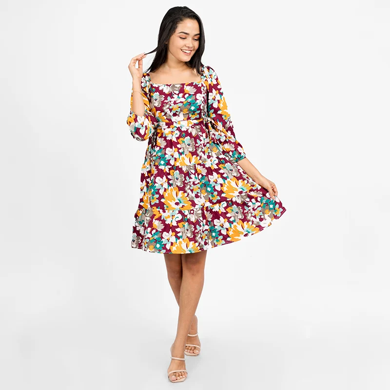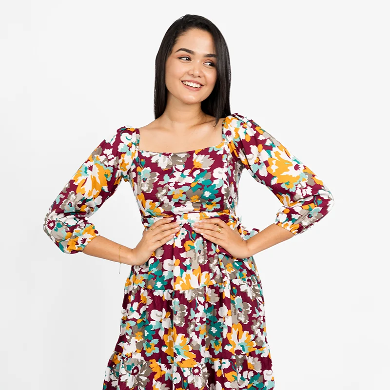 Unveil your playful side with this charming mini dress that blends elegance with youthful flair. Designed with a flattering square neckline, puffed sleeves, and a gently cinched waist, the tiered skirt adds a lively bounce to every step—perfect for twirls and compliments alike.