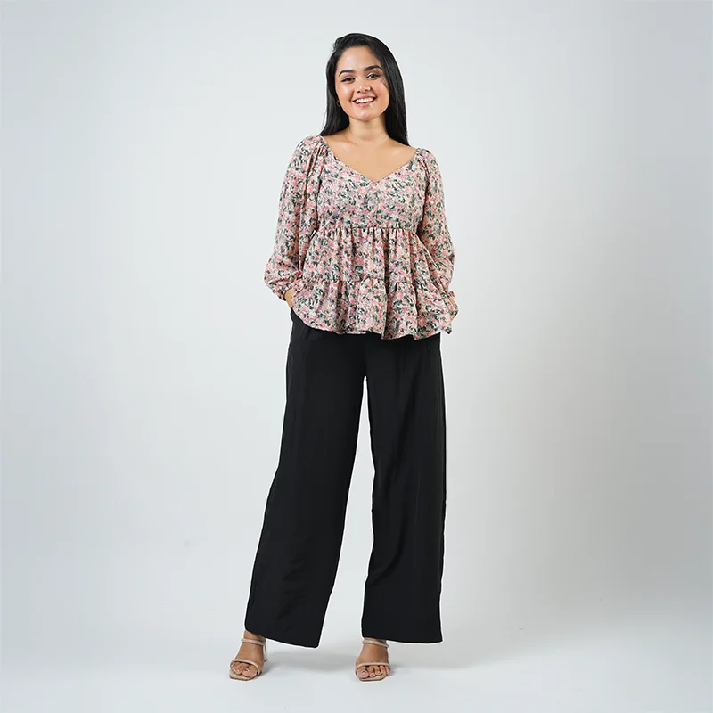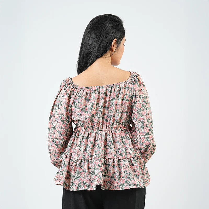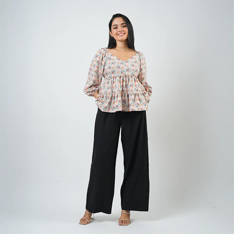 Embrace soft, romantic charm with this beautifully tiered peplum blouse. Designed with a flattering V-neckline and voluminous long sleeves, it offers a graceful, flowy silhouette that feels light and effortlessly feminine. The delicate all-over floral pattern adds a touch of whimsy, making it a standout piece for any wardrobe.