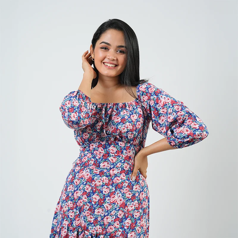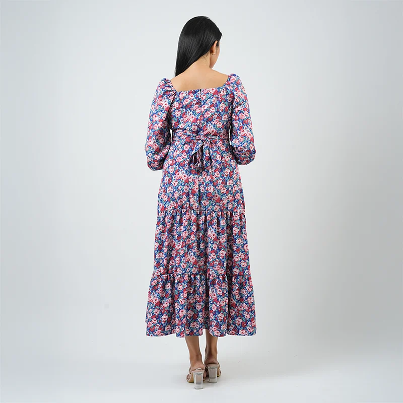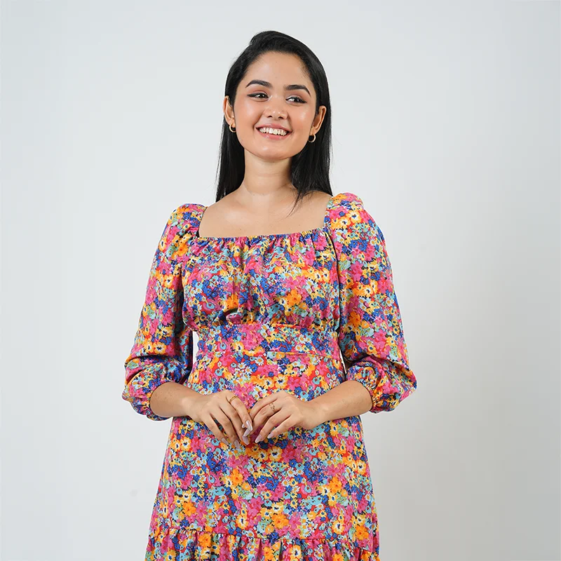 Infuse your wardrobe with cheerful elegance through the Petal Whirl Midi Dress — a perfect harmony of charm and ease. Designed with a flattering square neckline, puffed sleeves, and a softly gathered bust, this dress flows into a tiered skirt that moves gracefully with every step. Its floral-inspired pattern adds a lively, feminine touch that brightens any day.
