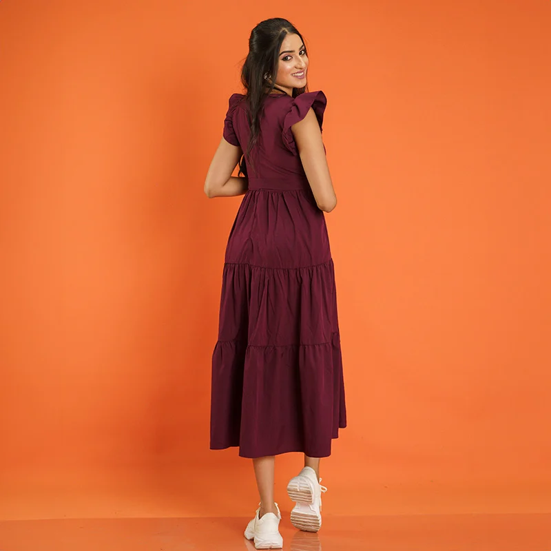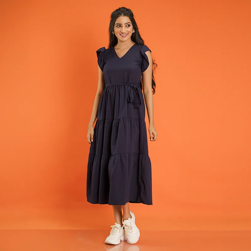 This tiered midi dress with flutter sleeves and a feminine V-neckline offers a graceful yet playful look. The self-tie belt enhances your figure, while the flowy design adds effortless charm. Made from lightweight, breathable Maza fabric, it’s perfect for staying comfortable in style. Ideal for casual brunches, shopping days, or weekend events, this versatile dress pairs perfectly with sneakers for a sporty vibe or wedges for a polished finish. Available in sizes UK 8-16 (S-2XL).