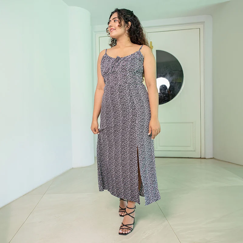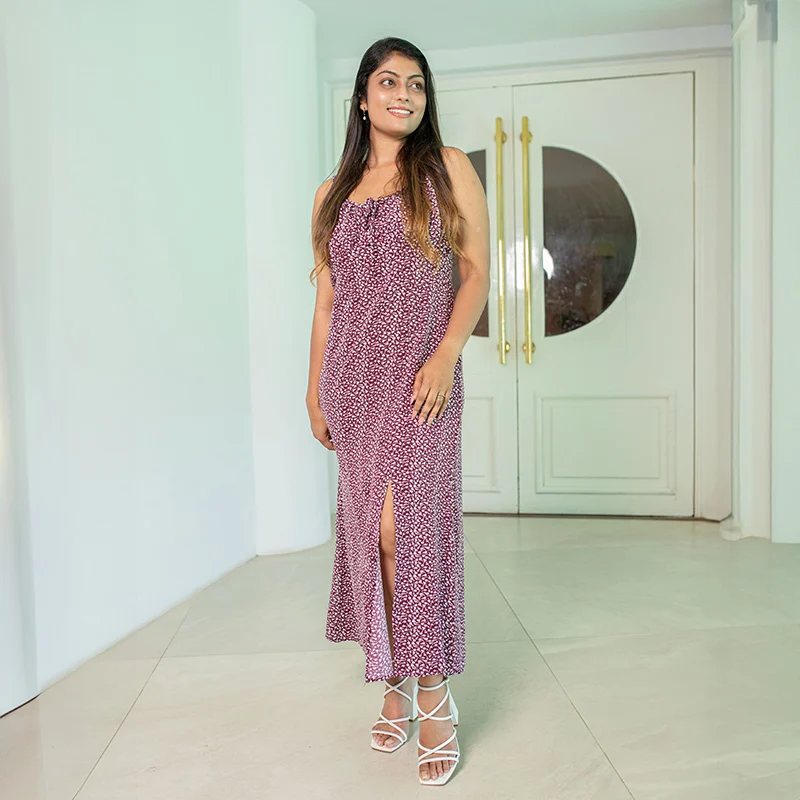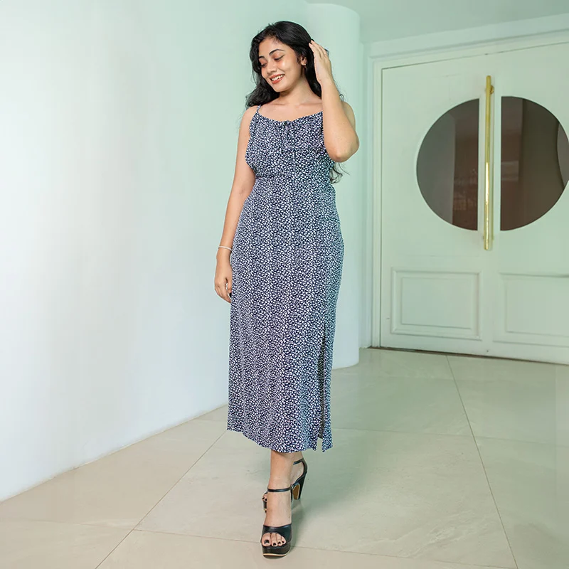 The Selena Side Slit Maxi Dress combines elegance and comfort, perfect for casual or semi-formal occasions. With a delicate white floral print and sleeveless design, this dress offers a light, airy feel, ideal for warmer weather. A subtle ruffle detail on the neckline adds charm, while the front slit ensures easy movement. Made from breathable Maza fabric, it drapes beautifully on the body for a flattering silhouette. Pair with sandals or wedges and minimalistic jewelry for a versatile look that suits both daytime outings and evening gatherings.