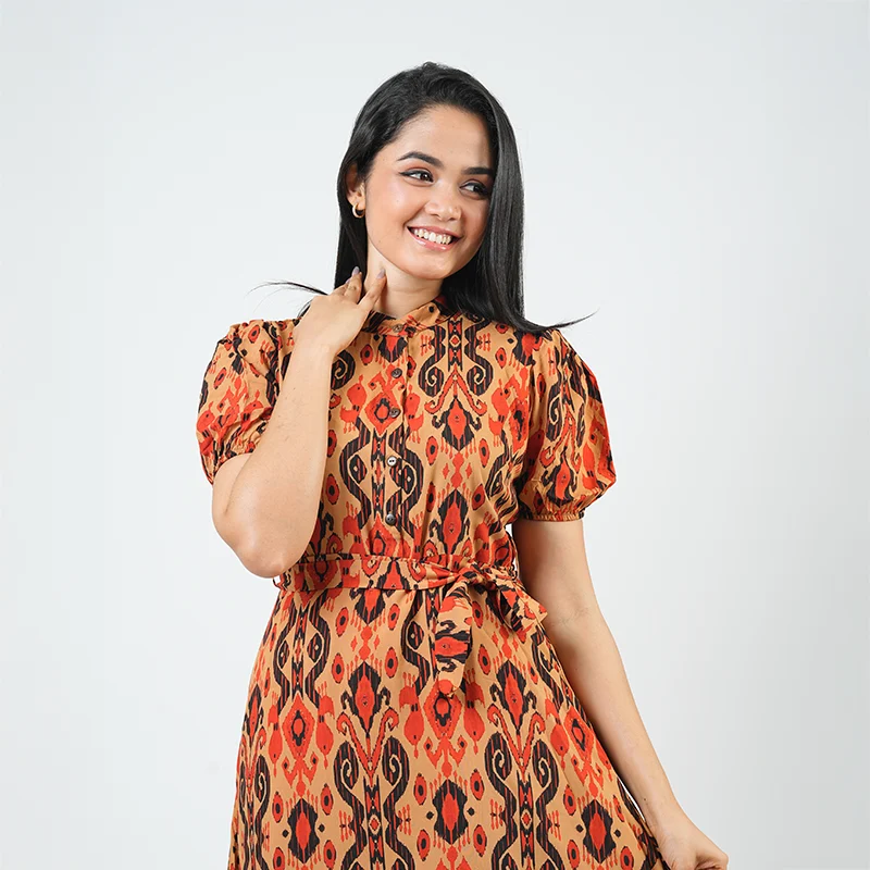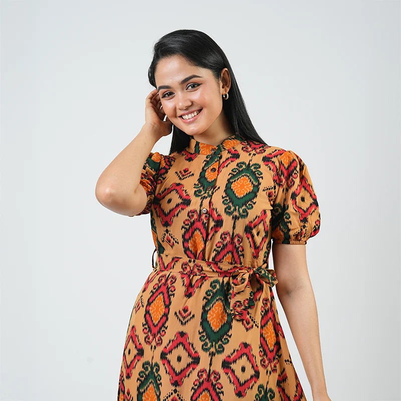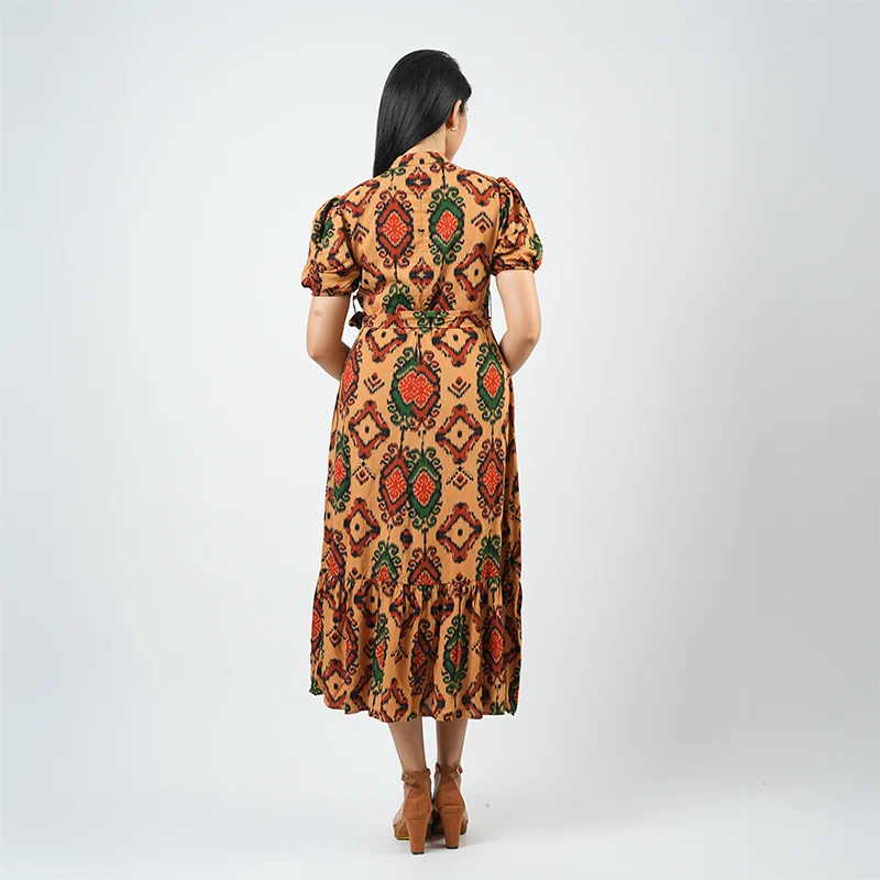 Infuse your look with vibrant sophistication in the Solara Muse Midi Dress — a perfect blend of artistry and effortless grace. Designed with a high neckline, softly puffed sleeves, and a flowy tiered hem, it creates a flattering silhouette that moves beautifully with every step. The waist tie adds definition and charm, offering a versatile fit that complements any figure.