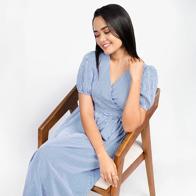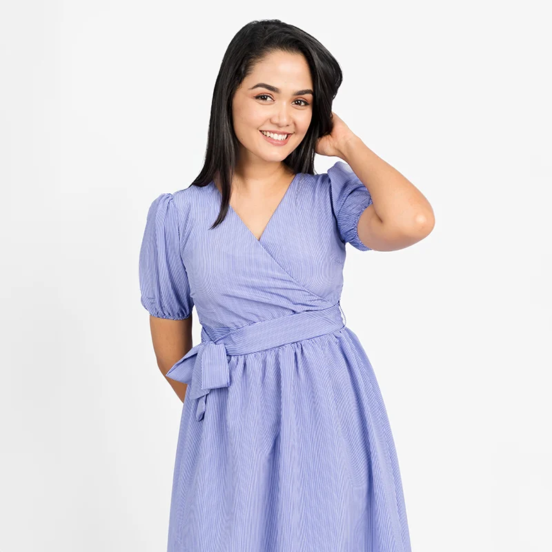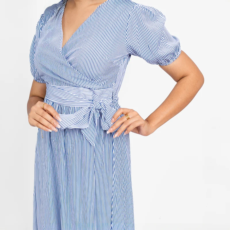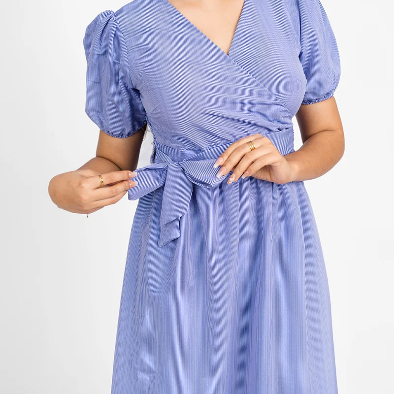 A celebration of grace and subtle charm, this wrap-style midi dress brings a timeless silhouette to life. The gently puffed sleeves add a touch of vintage-inspired romance, while the defined waist with a wraparound belt softly flatters your shape. The A-line skirt flows with ease, creating an effortlessly elegant movement with every step.