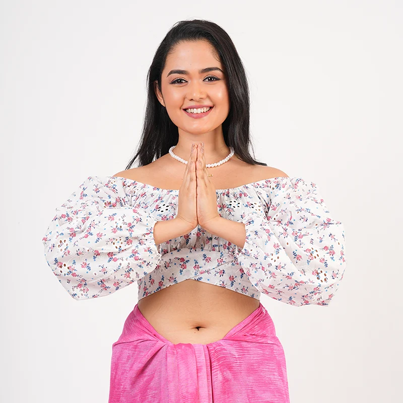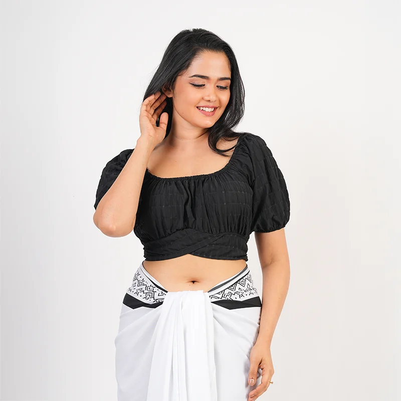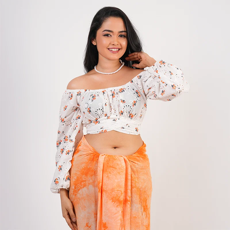 Embrace relaxed elegance with this thoughtfully designed crop and lungi set that blends contemporary style with traditional ease. The off-shoulder crop top features gentle gathers and voluminous sleeves, creating a soft, feminine silhouette with a flattering fit. Paired with a gracefully draped lungi, the set offers effortless movement and a naturally flowy appeal, making it both stylish and comfortable.