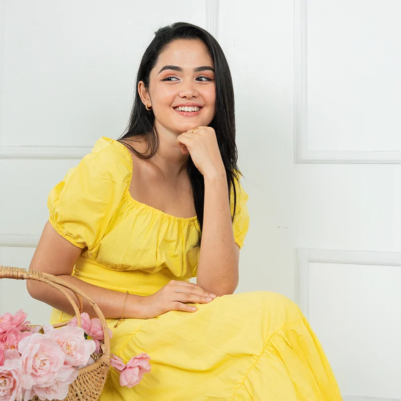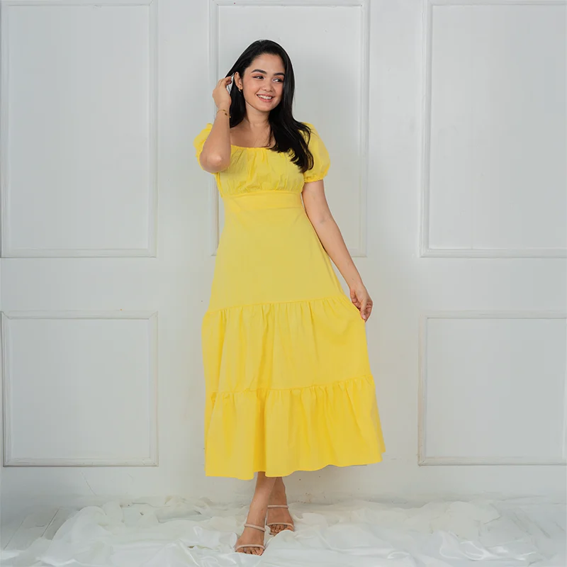 Bask in effortless charm with this breezy tiered midi dress that radiates joy and femininity. Designed with a soft square neckline and delicate puff sleeves, it offers a flattering, timeless silhouette. The gathered tiers add graceful movement, while the fitted bodice gently accentuates the waist for a romantic yet relaxed look.