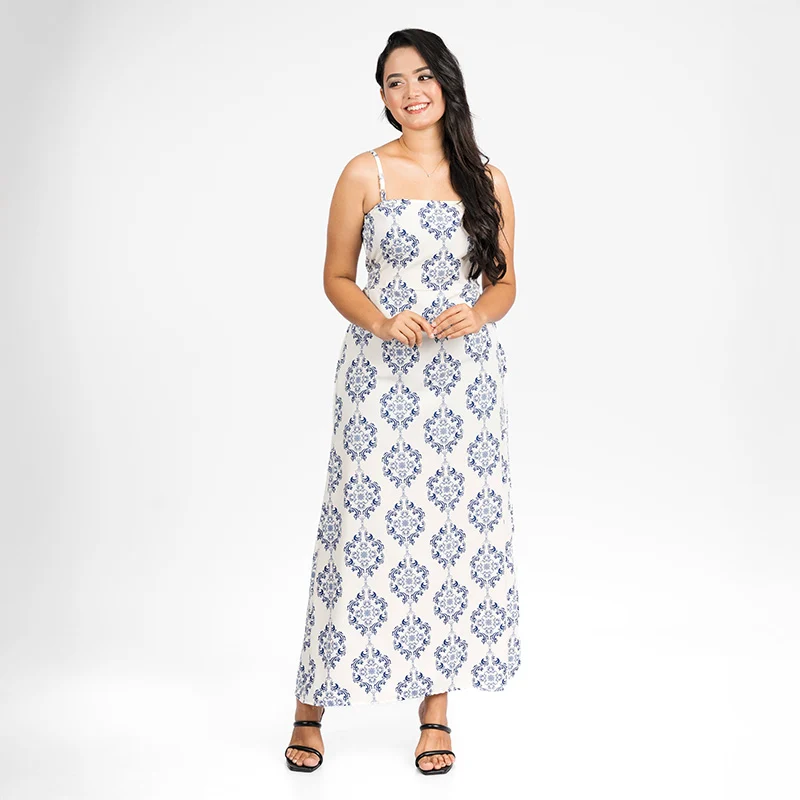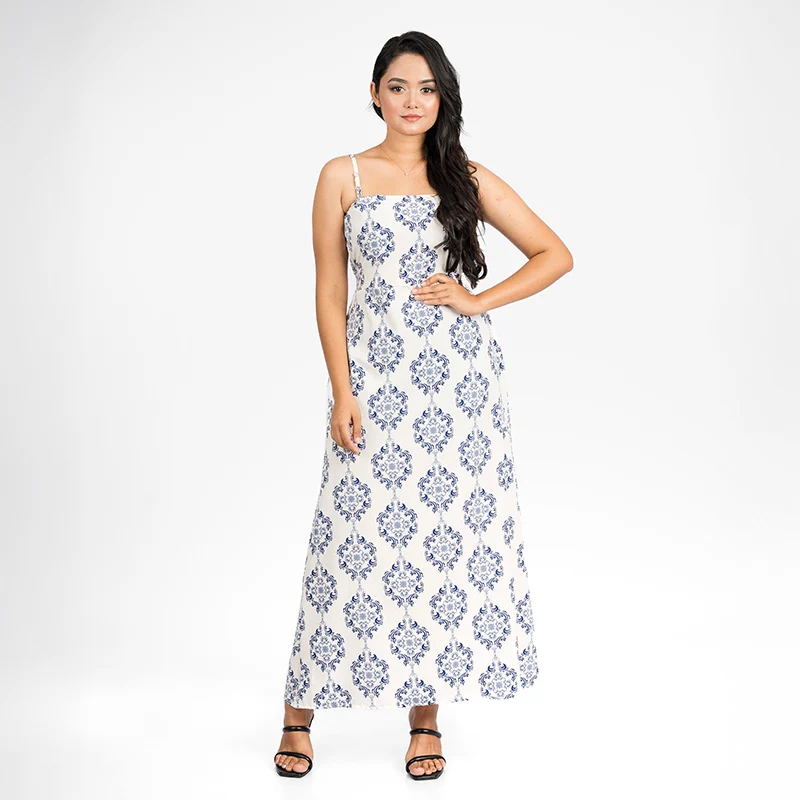 Channel effortless elegance with this beautifully designed maxi dress, featuring a classic silhouette that exudes grace and charm. The delicate strappy neckline offers a refined touch, while the flowing A-line design ensures both comfort and sophistication. The intricate print adds a hint of artistic flair, making this dress a standout piece for any occasion.