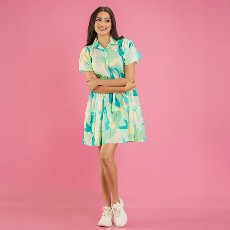 This vibrant printed dress is a playful mix of style and comfort, perfect for adding a pop of color to your wardrobe. Its short, puffed sleeves add a touch of charm and volume, while the collared neckline brings a structured yet relaxed feel. The gathered waist is adjustable with a belt, offering a flattering fit and a defined silhouette. The tiered skirt falls just above the knee, giving it a flirty, youthful vibe, ideal for casual outings. The lightweight fabric ensures maximum comfort, while the bold pattern and playful design make it a must-have for any fashion-forward wardrobe.