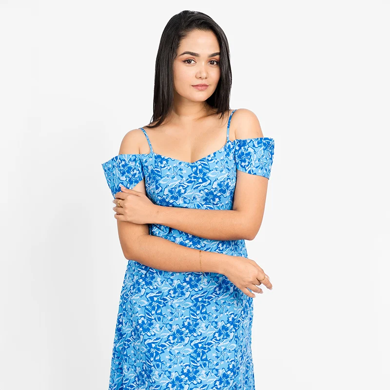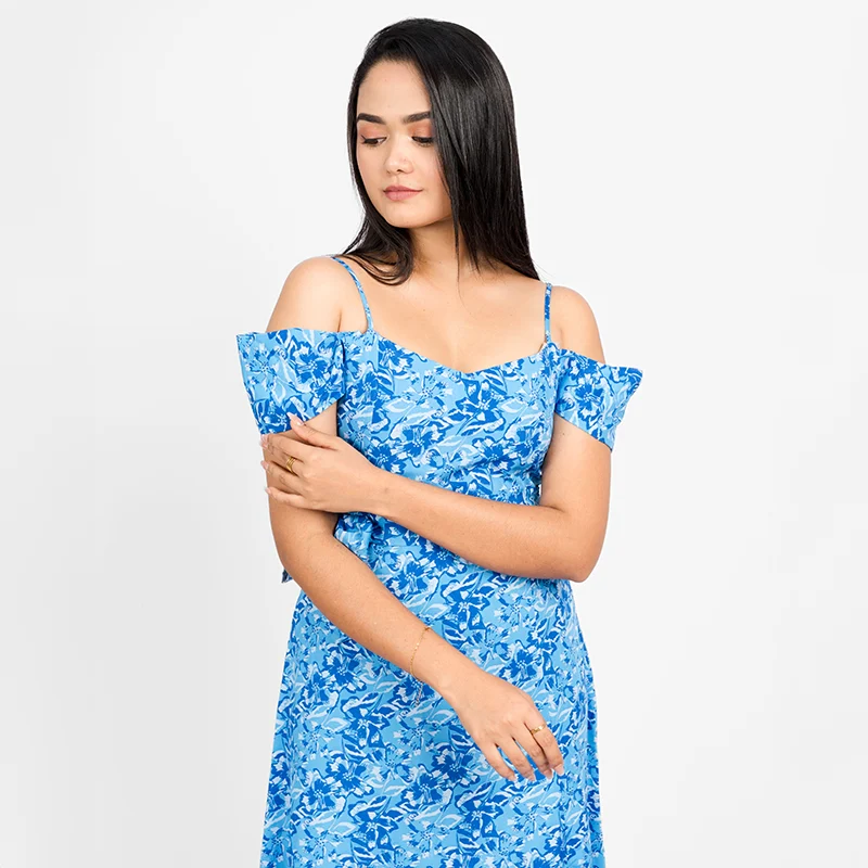 Step into the season with vibrant elegance in this off-shoulder slit dress. With its bold floral print and breezy silhouette, it features delicate shoulder straps, ruffled sleeves, and a high side slit that adds just the right amount of flair. A tie-around belt cinches the waist to accentuate your shape, while the flowing skirt moves gracefully with every step.