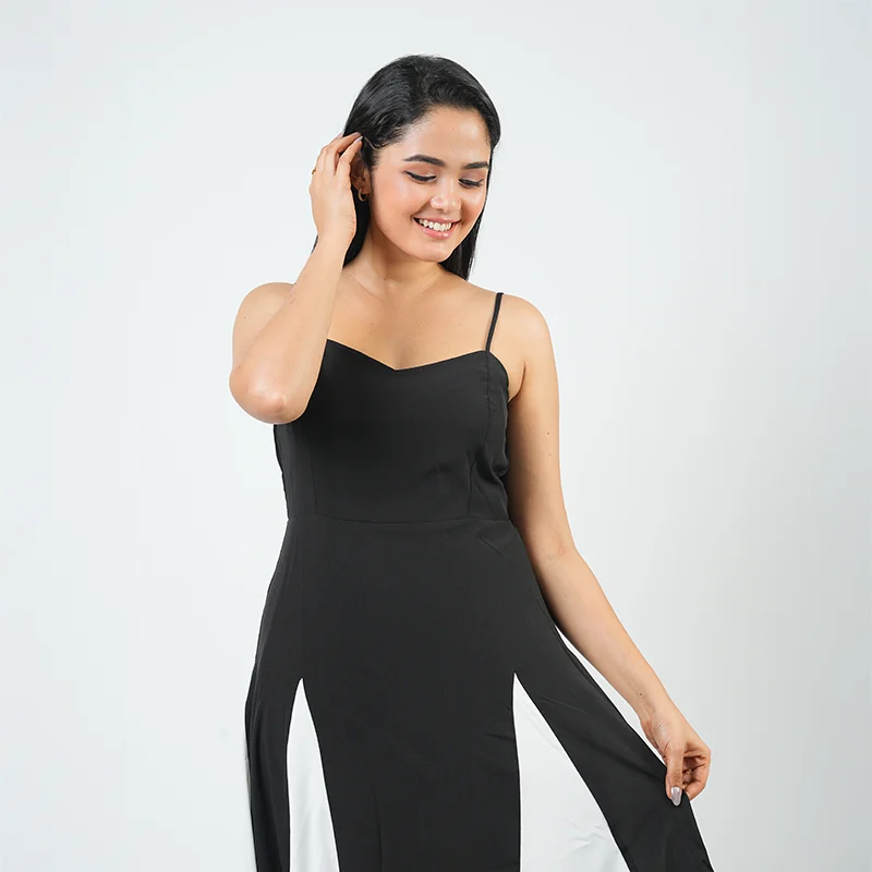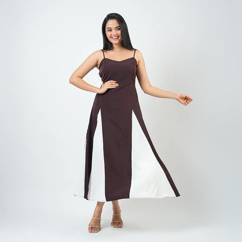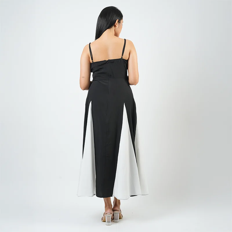 Make an unforgettable entrance with this fluid, gracefully flared maxi dress designed for movement and sophistication. The sleek bodice features delicate straps and a soft neckline, flowing effortlessly into a paneled skirt that creates a striking, dynamic swirl with every step. Its elegant contrast detailing elongates the silhouette while adding a modern, show-stopping touch.