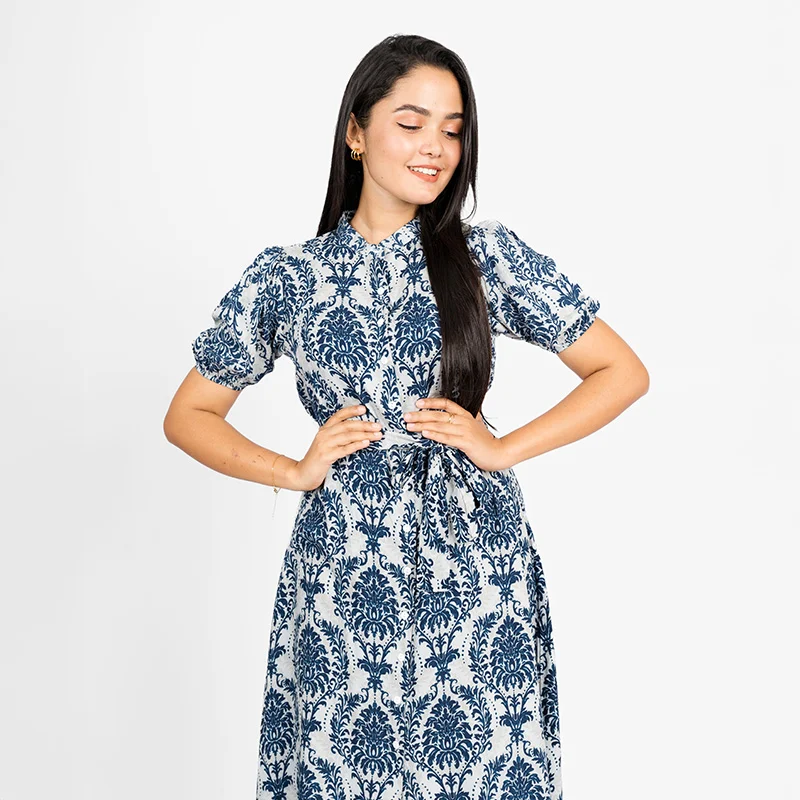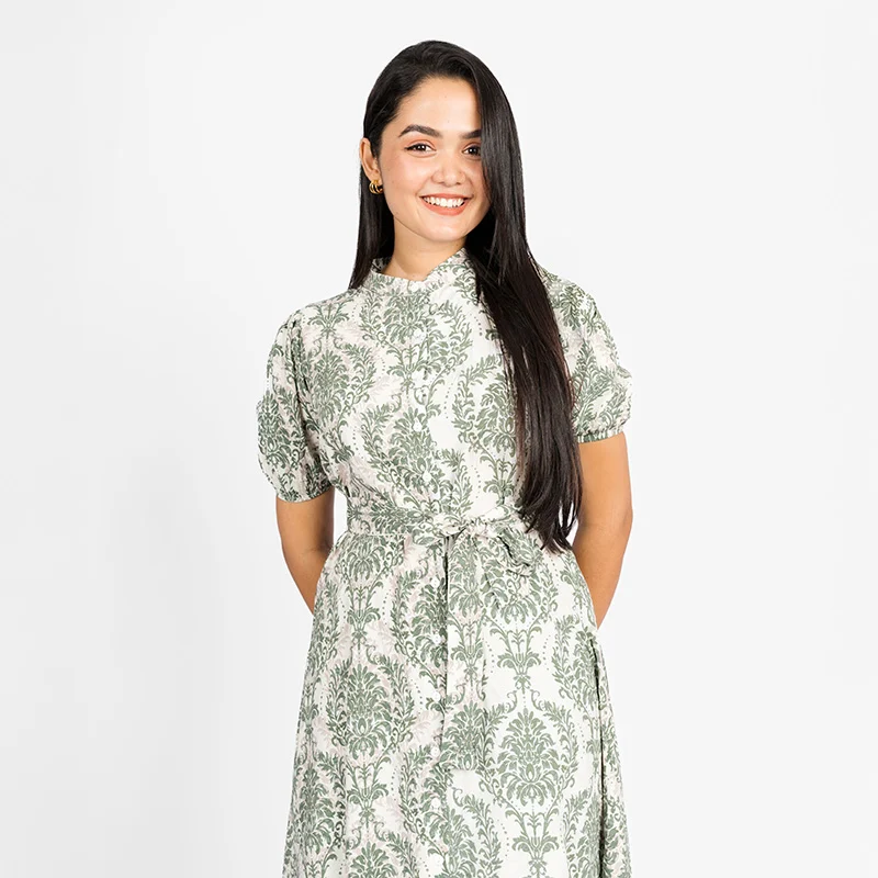 Step into timeless elegance with this charming midi dress featuring a classic floral damask print. Designed with subtle puff sleeves and a graceful high neckline, it flatters the figure with a cinched waist and a soft A-line flare. The self-tie belt enhances your silhouette, making this dress a lovely choice for refined yet relaxed occasions.