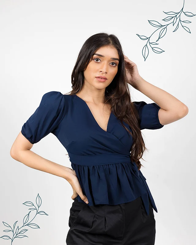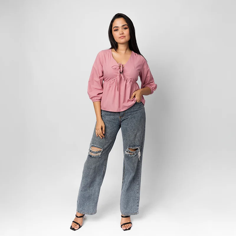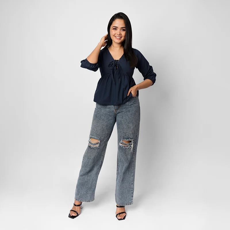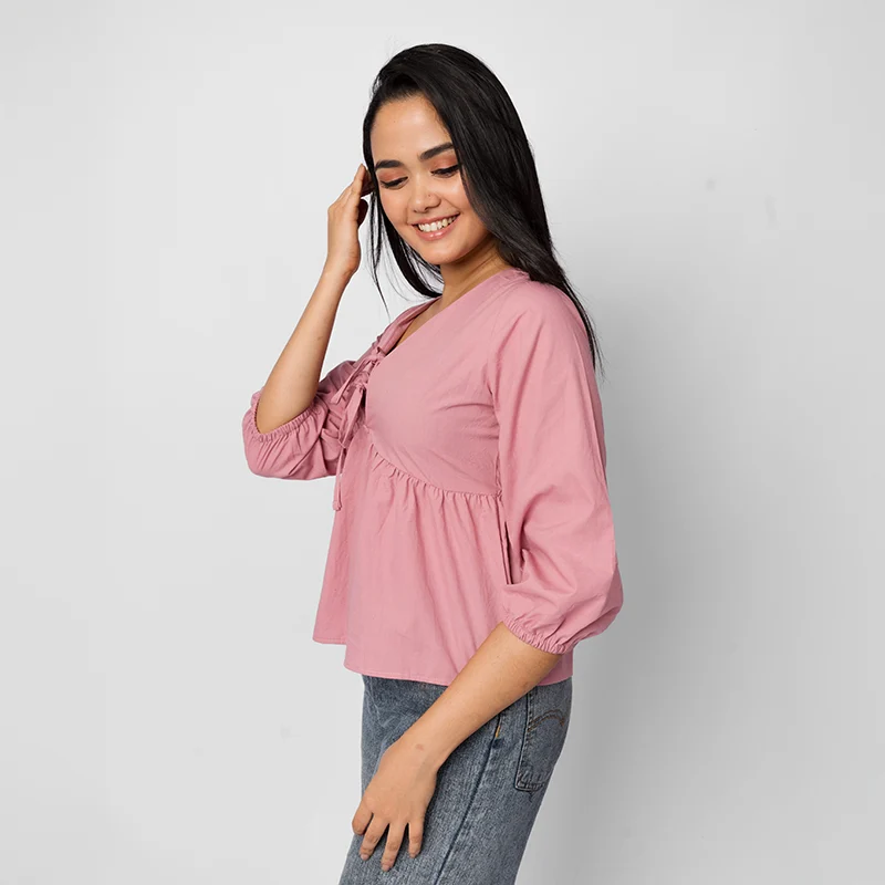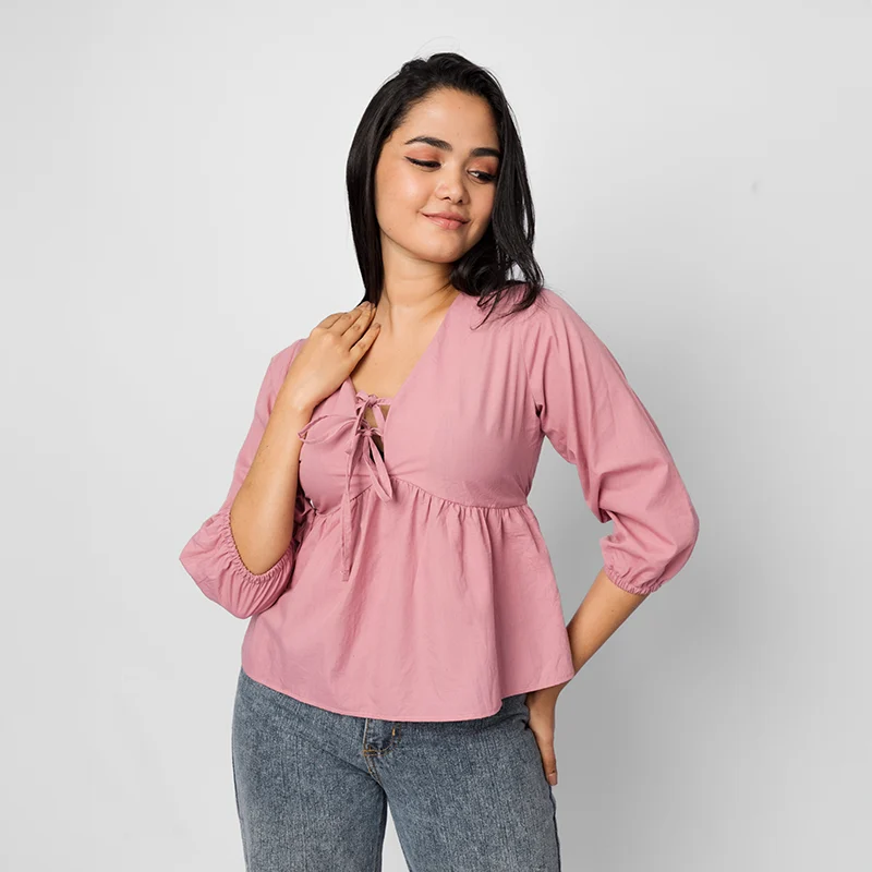 Add a touch of effortless elegance to your everyday style with this charming peplum blouse. Featuring a flattering V-neckline with delicate front tie details and three-quarter sleeves, it offers a relaxed fit that drapes beautifully while highlighting the waist with a gentle flare.
