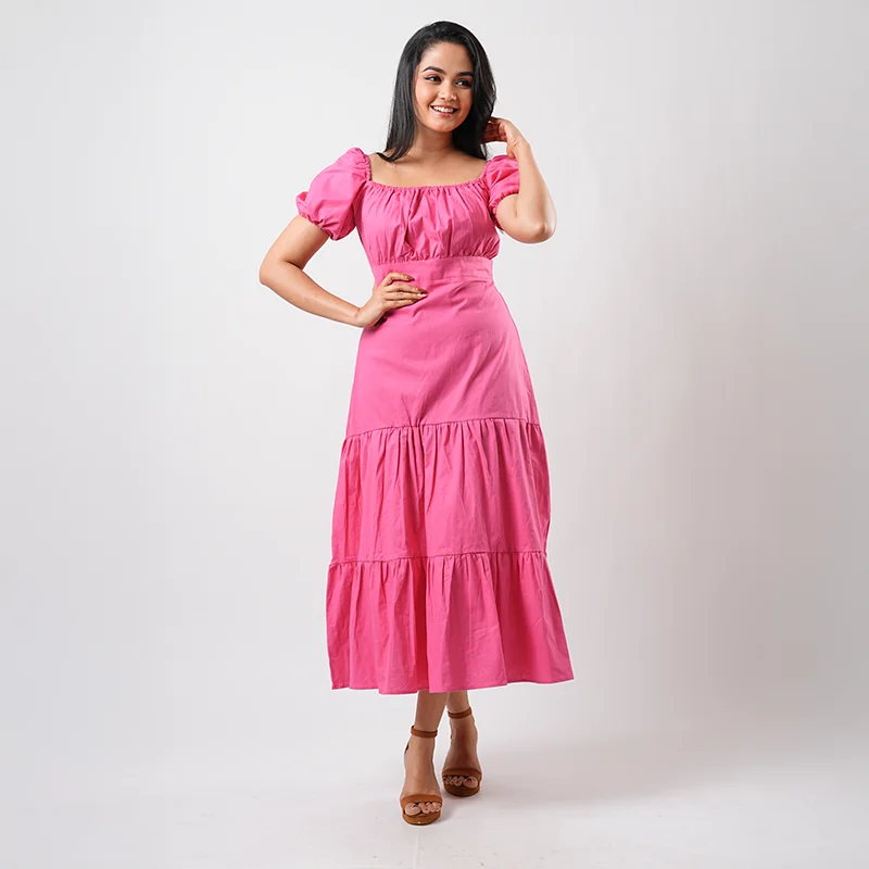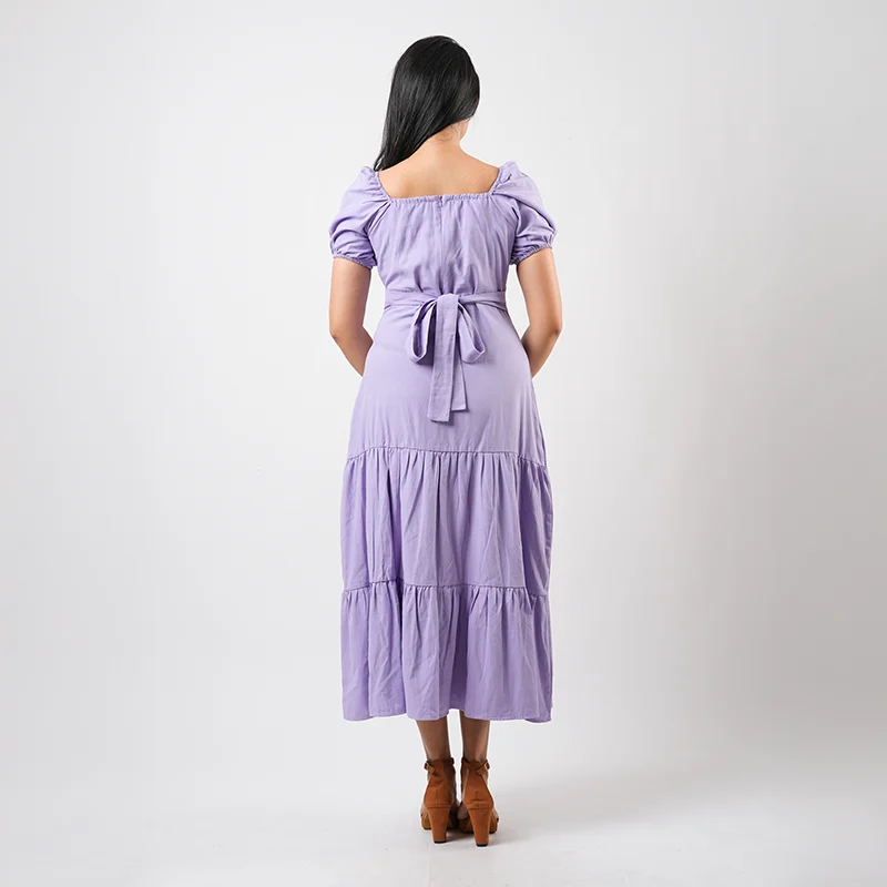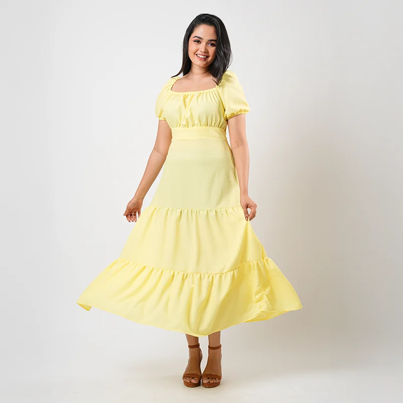 Step into effortless elegance with this beautifully balanced midi dress designed for everyday charm. Featuring soft puffed sleeves and a gentle square neckline, the bodice is lightly gathered for a flattering fit, while the defined waist flows into a tiered skirt that adds graceful movement and feminine appeal. The silhouette is relaxed yet refined, making it a timeless wardrobe staple.