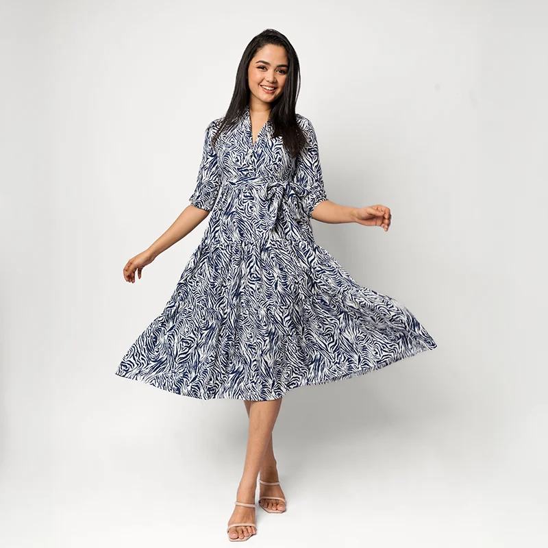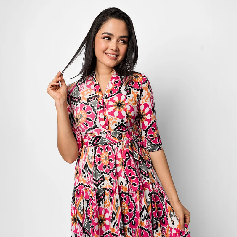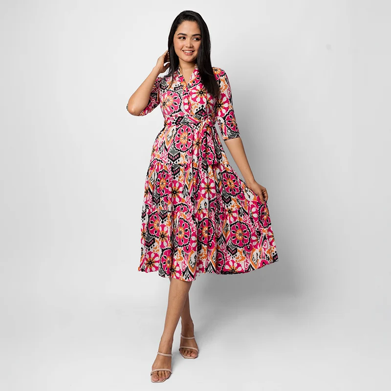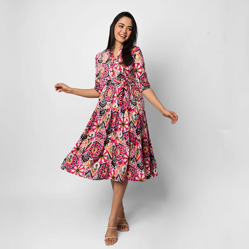 Effortlessly chic, this midi dress blends classic charm with modern ease. Designed with a flattering V-neckline and half sleeves, it flows into a tiered, softly flared skirt that moves gracefully with every step. A matching tie belt cinches the waist, offering a versatile fit that enhances your silhouette with understated elegance.