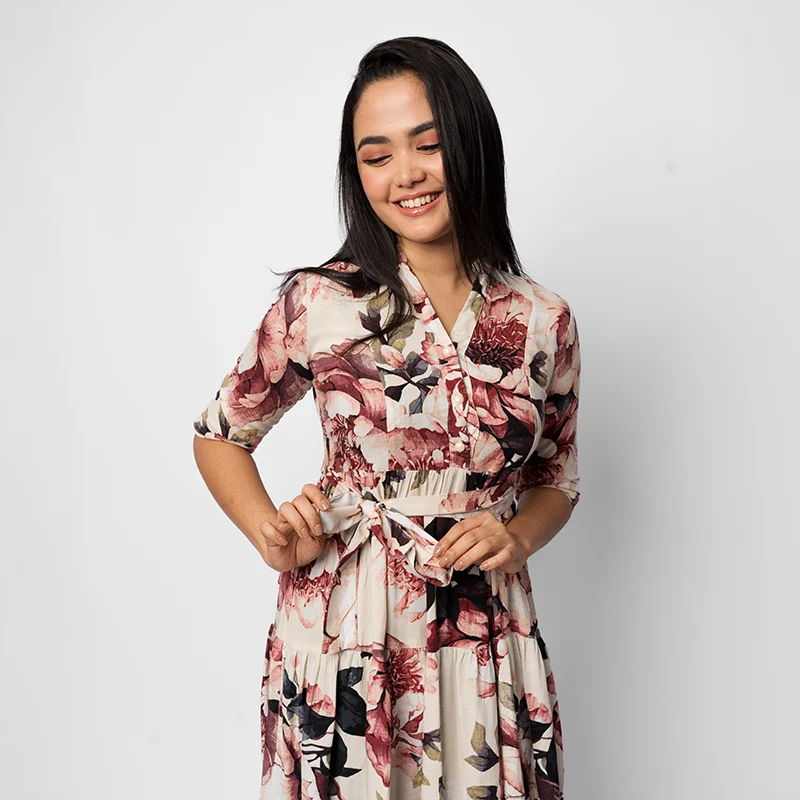 Crafted with smooth maza fabric, this dress offers a lightweight feel and refined drape. The breathable texture ensures comfort throughout the day, while its polished finish adds a touch of sophistication.